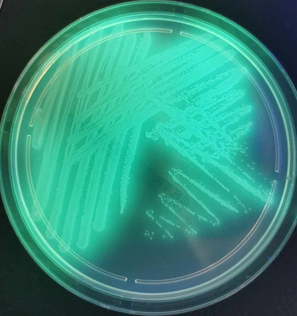 - Fluorescencja – charakterystyczną cechą tej bakterii jest produkcja barwników fluorescencyjnych m.in. piocyjaniny, piowerdyny. Barwniki te emitują światło pod wpływem promieniowania ultrafioletowego (UV), dzięki tej właściwości, kolonie na podłożach mikrobiologicznych mogą świecić w ciemności po naświetleniu UV.